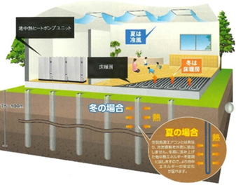 地中熱利用冷暖房とは、再生可能エネルギーとして地中熱を利用した冷暖房設備です。